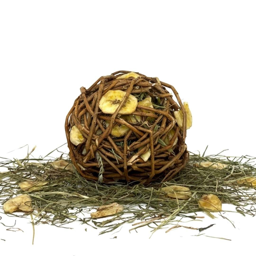 Esferas de sauce natural trenzadas a mano y rellenas de heno alemán de calidad con chips de plátano deshidratado, ricos en fibra y potasio. Aportan nutrición, favorecen la digestión, el desgaste dental y estimulan la curiosidad de conejos y pequeños roedores, evitando el aburrimiento.