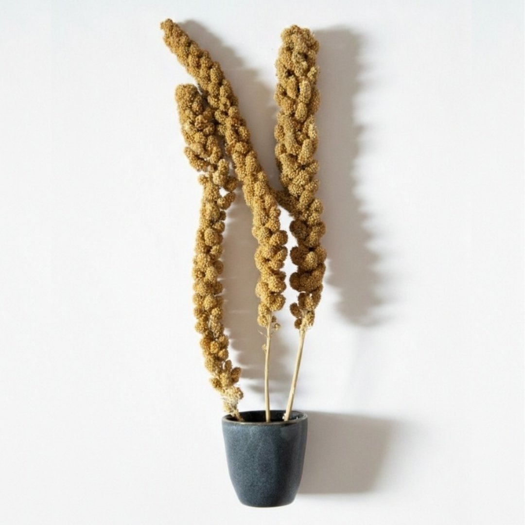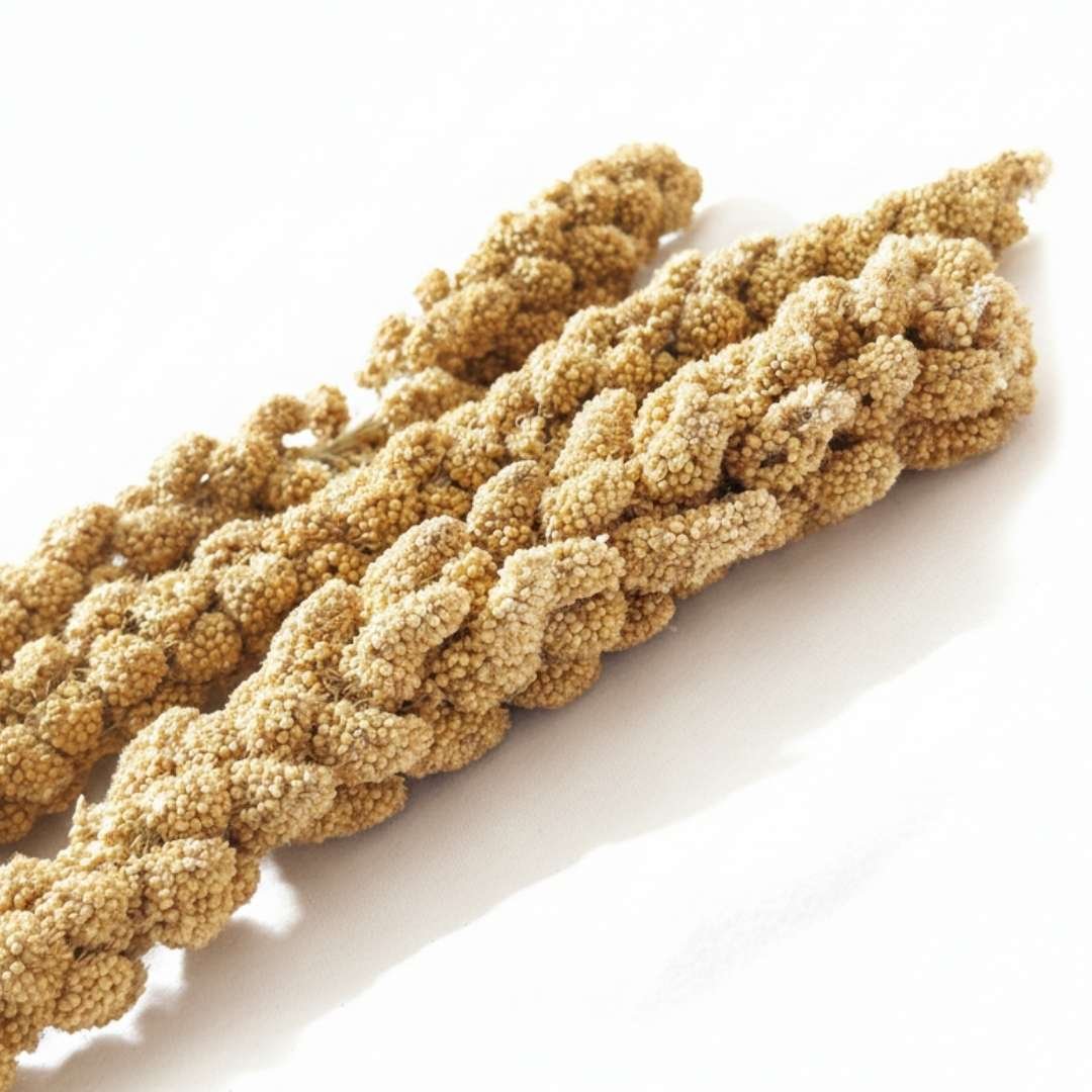 Mijo en espiga amarillo de origen alemán, 100% natural y sin procesar. Un complemento ideal en la alimentación y para el hábitat de hámsters, jerbos, ratas y ratones, pensado para estimular el comportamiento natural de forrajeo.