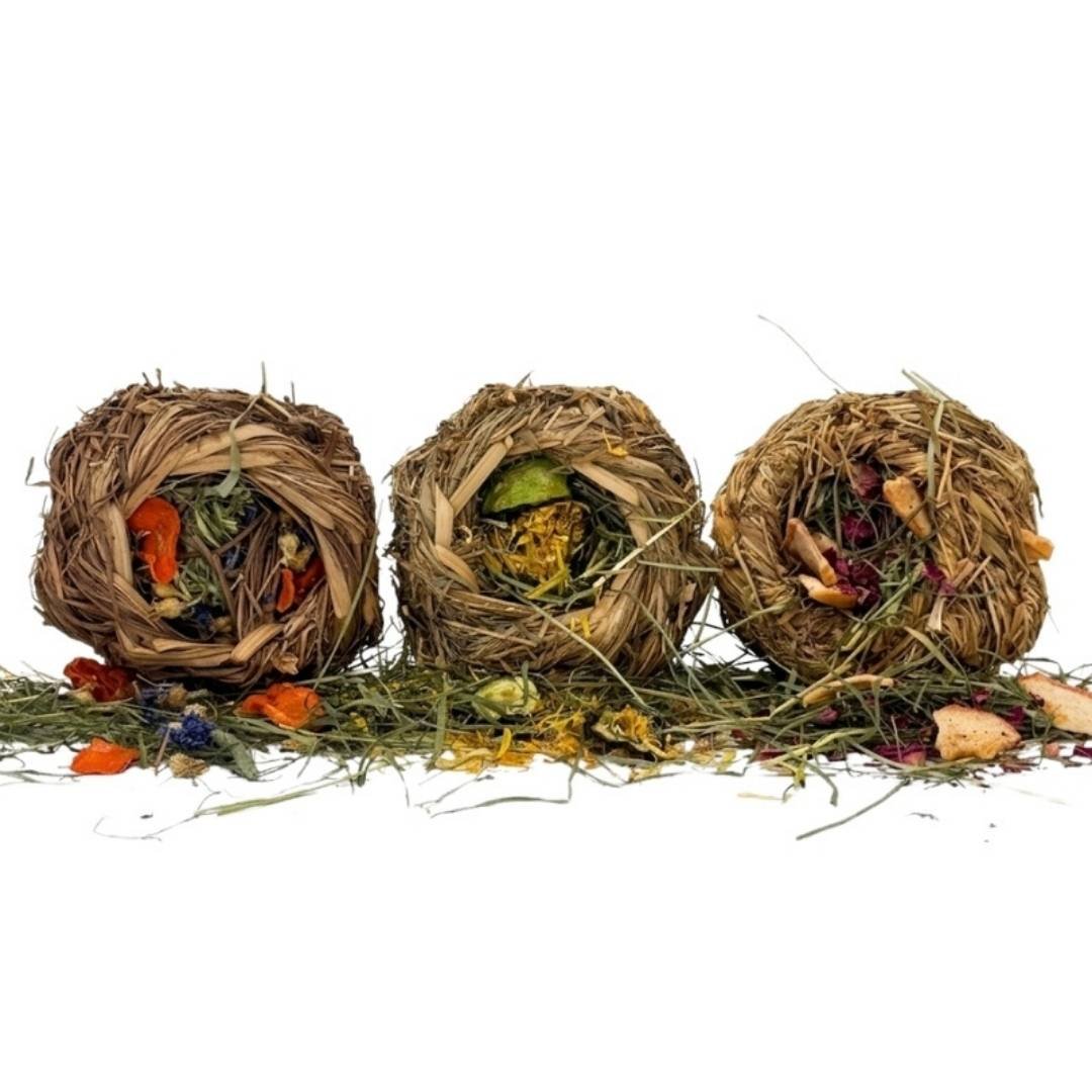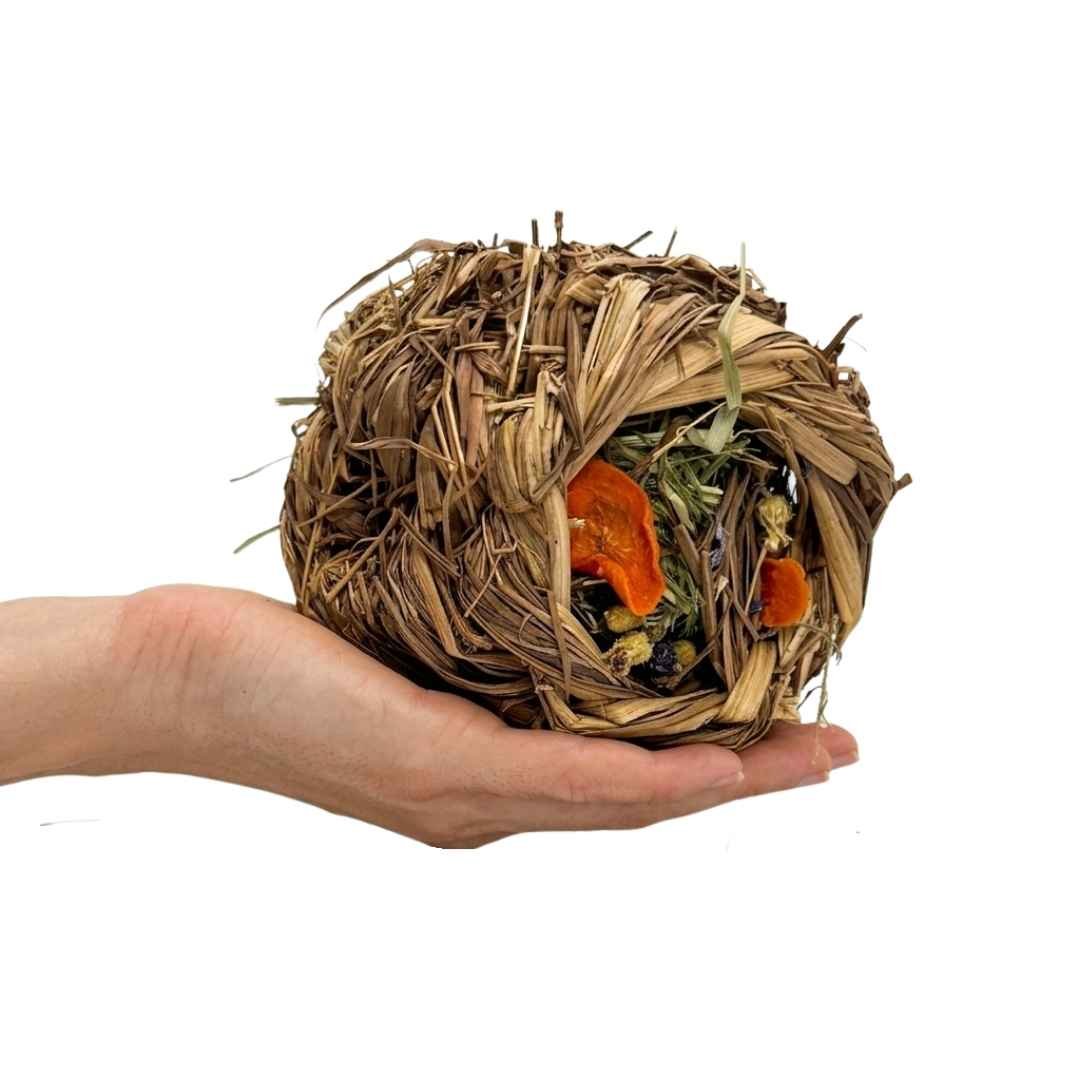 Nidos de fibras naturales, hechos a mano y rellenas de heno alemán con chips deshidratados y pétalos de flores. Estos ingredientes aportan fibra, contribuyen al refuerzo digestivo y ofrecen propiedades antiinflamatorias y antioxidantes. Estimulan la curiosidad, el entretenimiento y el desgaste dental de conejos y roedores, favoreciendo su bienestar.