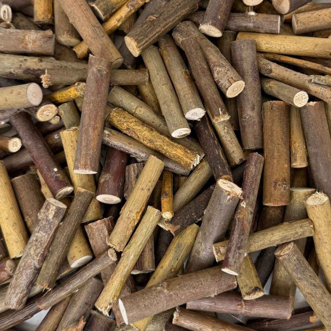 Tronquitos de sauce naturales, ideales para el desgaste dental y el enriquecimiento ambiental de conejos y roedores. La madera de sauce es una de las más seguras y apreciadas por su sabor suave y su textura agradable.
